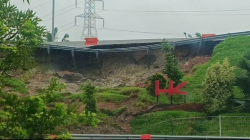 ‎Pantauan awak media, beberapa pekerja terlihat sedang melakukan pengamanan di jalur tol tersebut. Tebing tanah penahan konstruksi jalan ambrol. Plat besi pembatasnya juga ambruk bersama beton lintasan jalan.