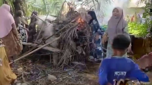 Ibu-ibu perwiritan menggerebek lokasi yang diduga sarang narkoba di Dusun Pematang Langkat, Desa Pematang Cengal, Tanjung Pura, Langkat, Jumat, 21 November 2025. Aksi memicu kehebohan warga karena para ibu menemukan sejumlah bong dan membakar lokasi tersebut.