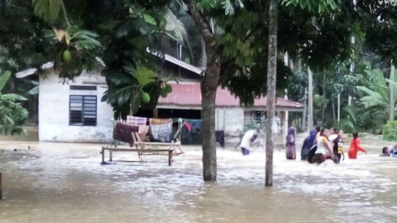 Di Desa Harapan Baru banjir mengakibatkan akses jalan terputus, pohon tumbang, longsor, dan satu rumah tertimpa.