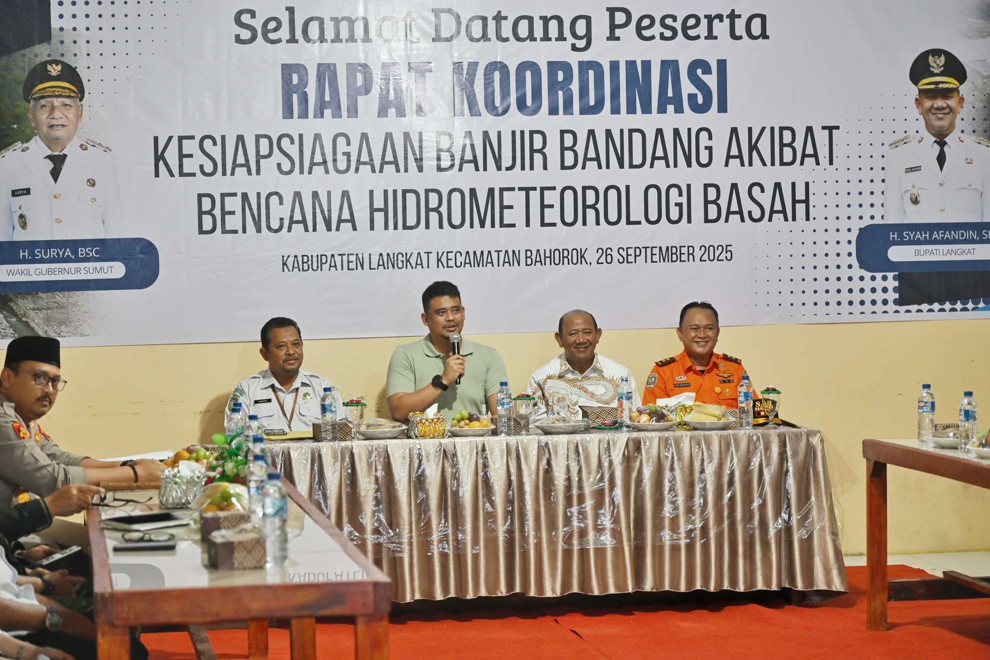 Rapat terkait kesiapsiagaan banjir bandang akibat bencana hidrometeorologi basah, berlangsung di Kantor Camat Kecamatan Bahorok, Jumat 26 September 2025.
