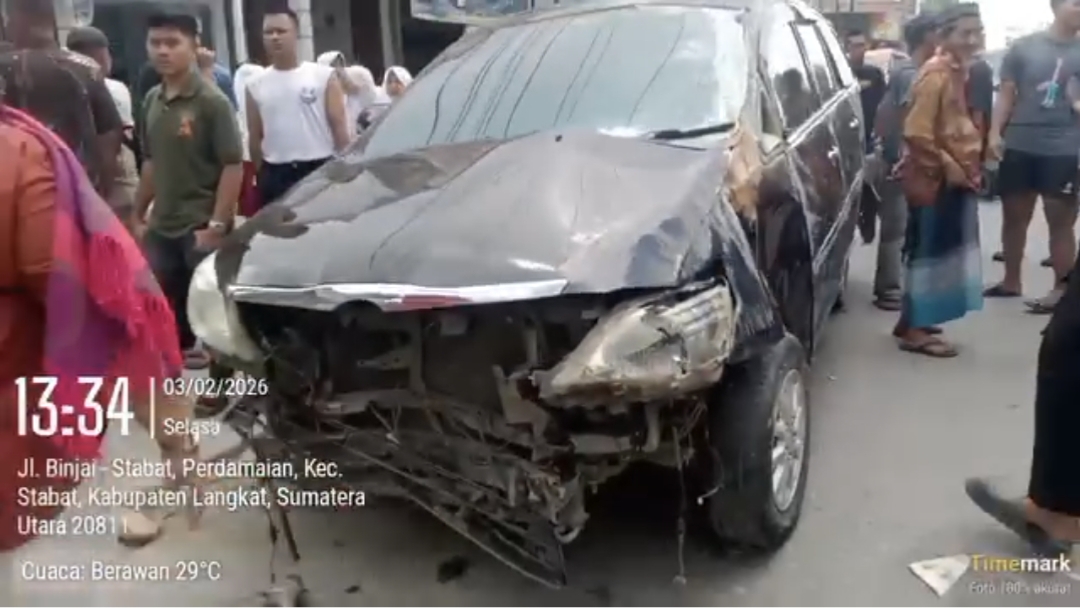 Satu unit mobil Kijang Innova bernomor polisi BK 1130 LYA tabrak pulau jalan di Jalan Jendral Sudirman, Perdamaian, Stabat, Langkat, Selasa, 3 Februari 2026.