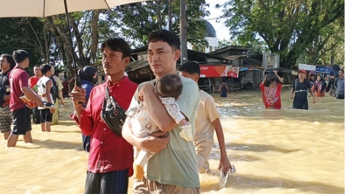 “Sudah 6 hari (banjir), mulai dari hari Rabu kemarin. Semalam ada bantuan pangan masuk, dari relawan-relawan gitu. Kalau bantuan dari pemerintah, baru hari ini lah masuk. Karena memang di sekitar sini semua terkepung air,” kata salah seorang warga yang mengungsi di Masjid At Taqwa.